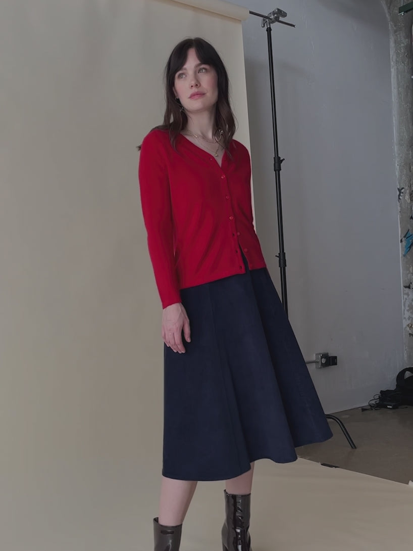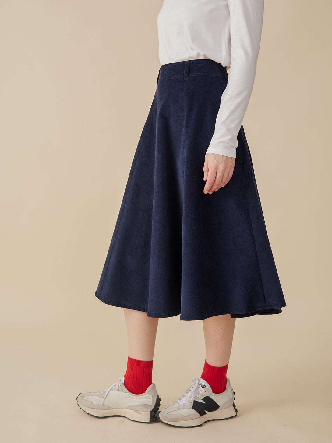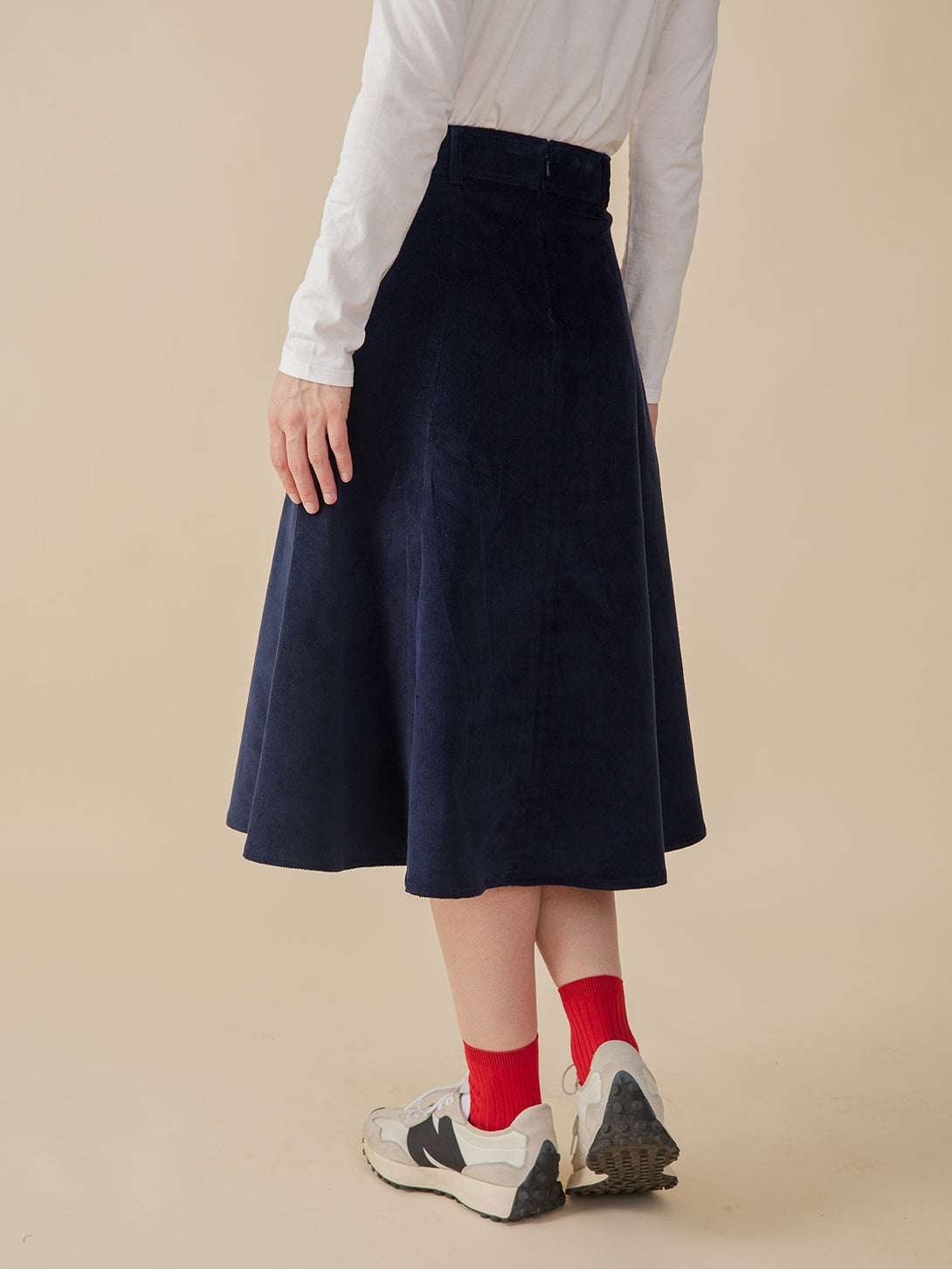 Add academic charm to your wardrobe with this high-waisted 1950s-inspired A-line corduroy skirt, featuring belt loops and a center back zipper. The classic retro silhouette creates the perfect playful shape, complete with convenient side pockets and a rich navy corduroy for endless styling possibilities.