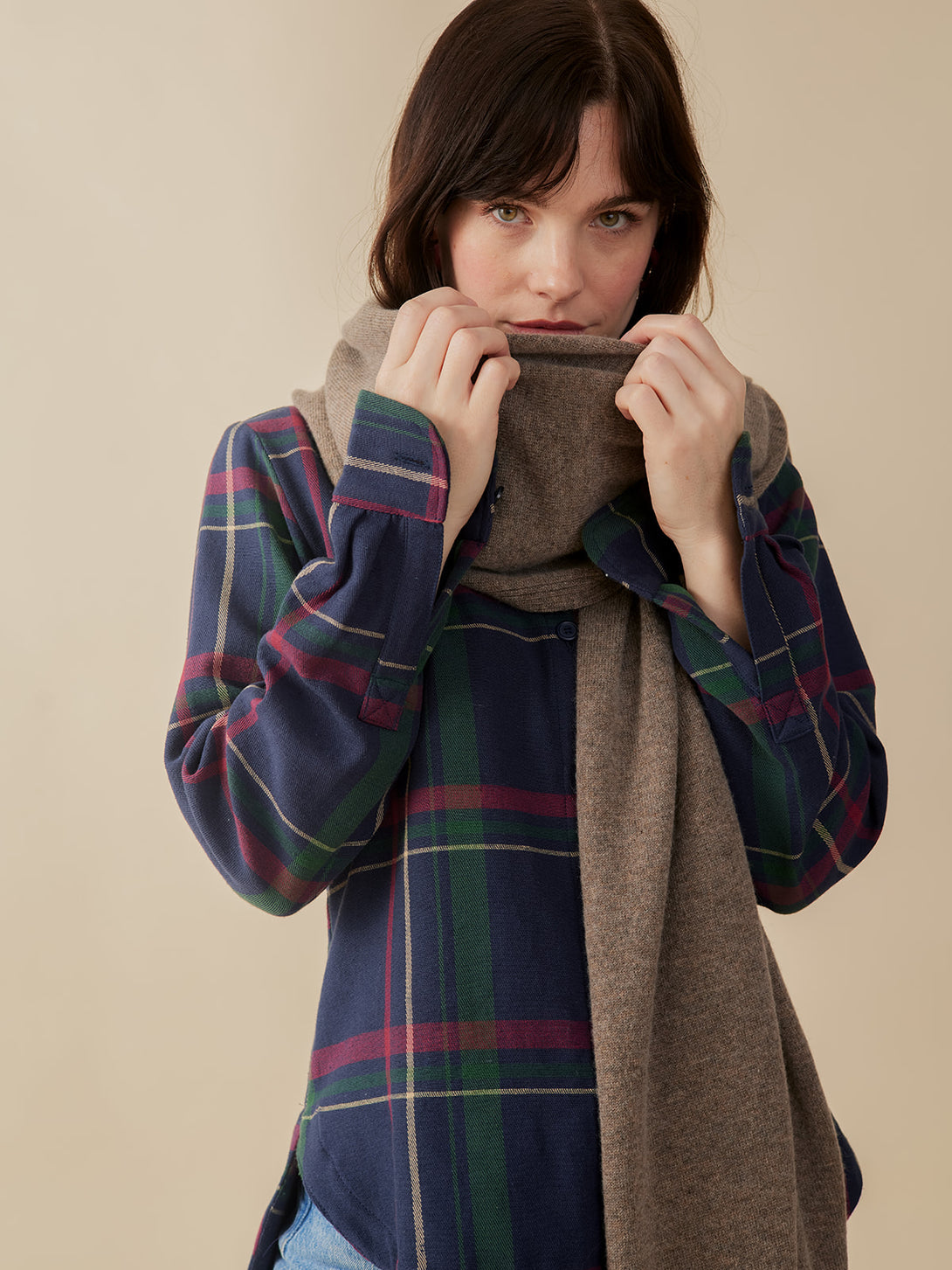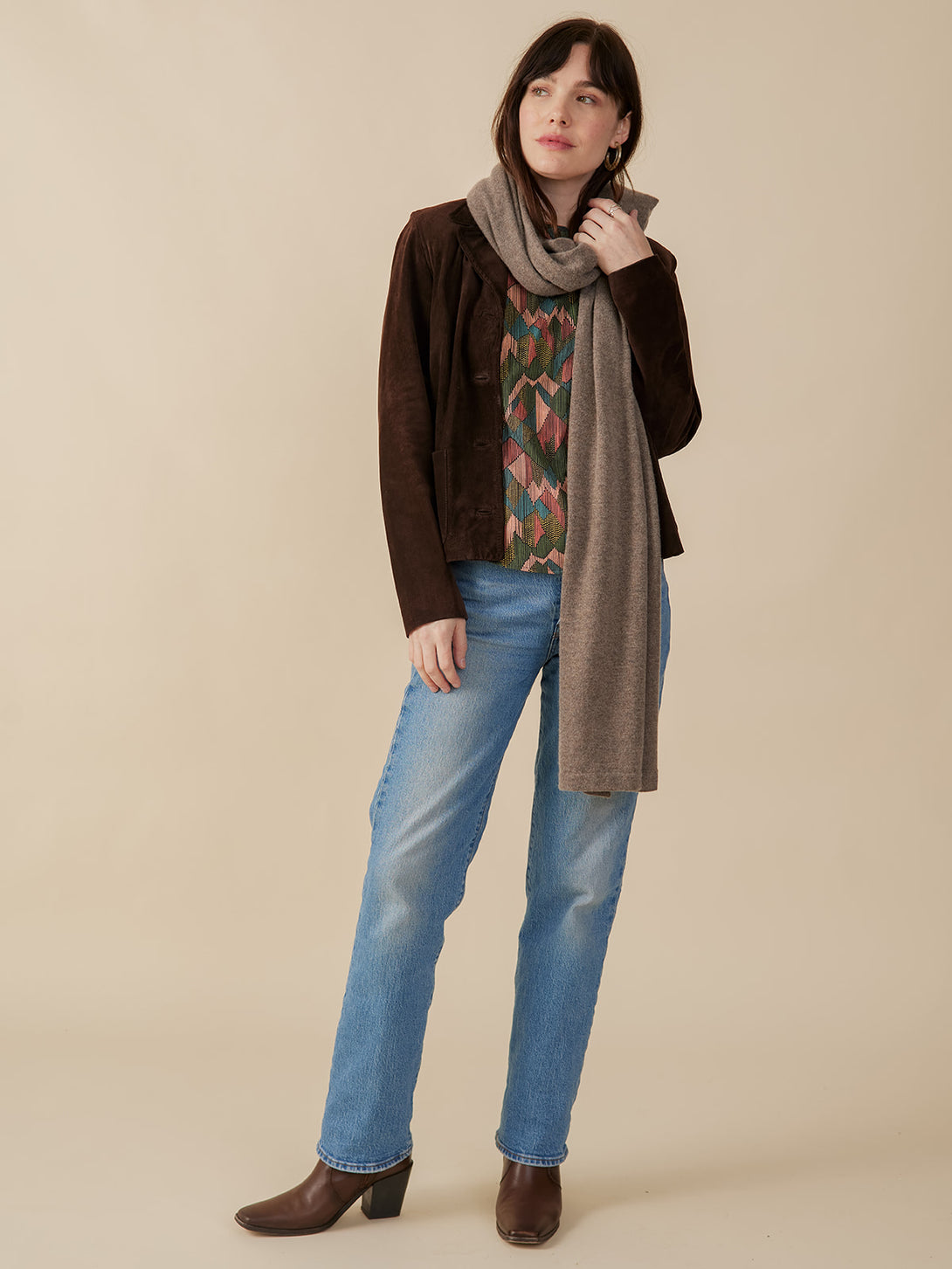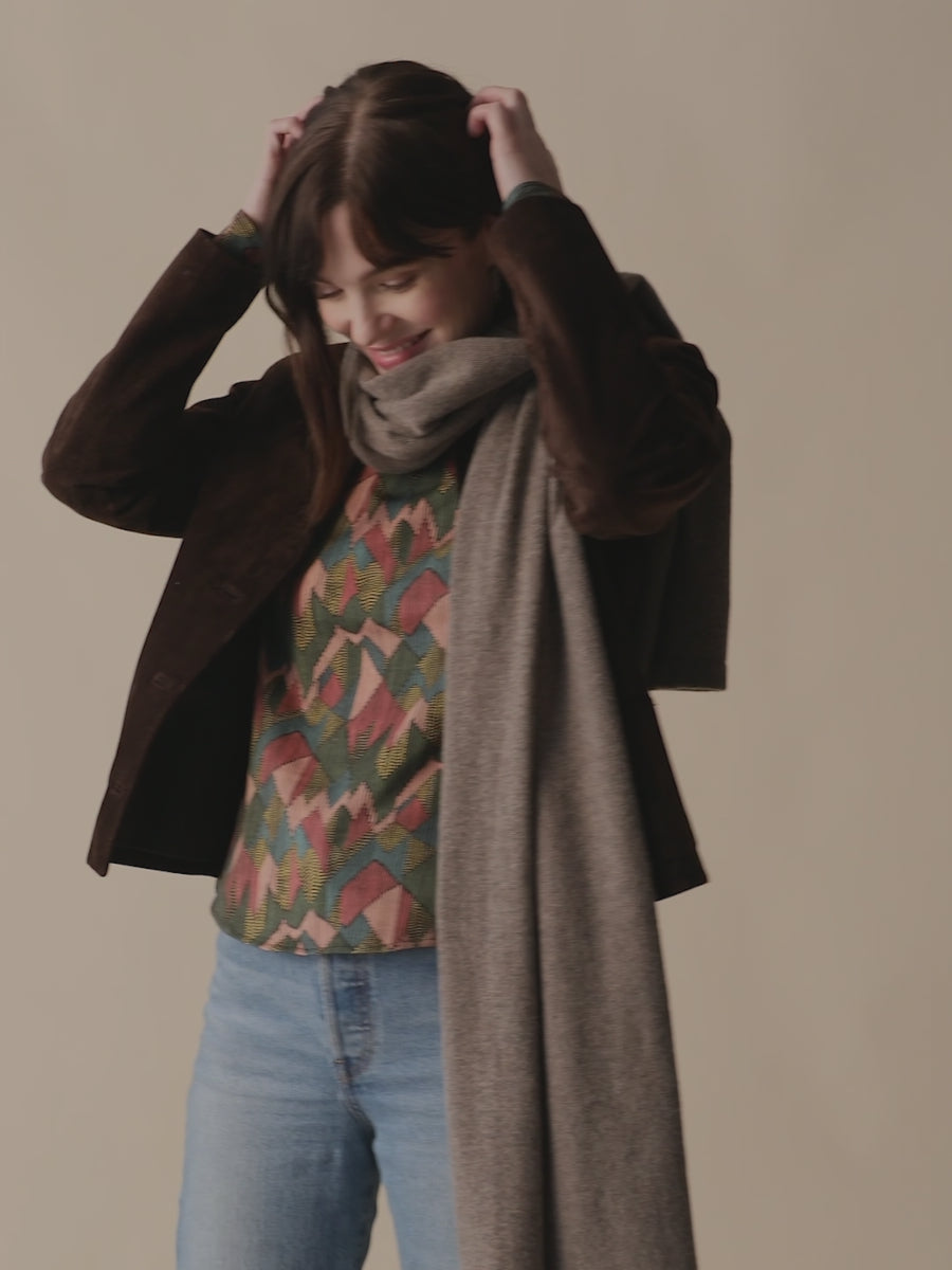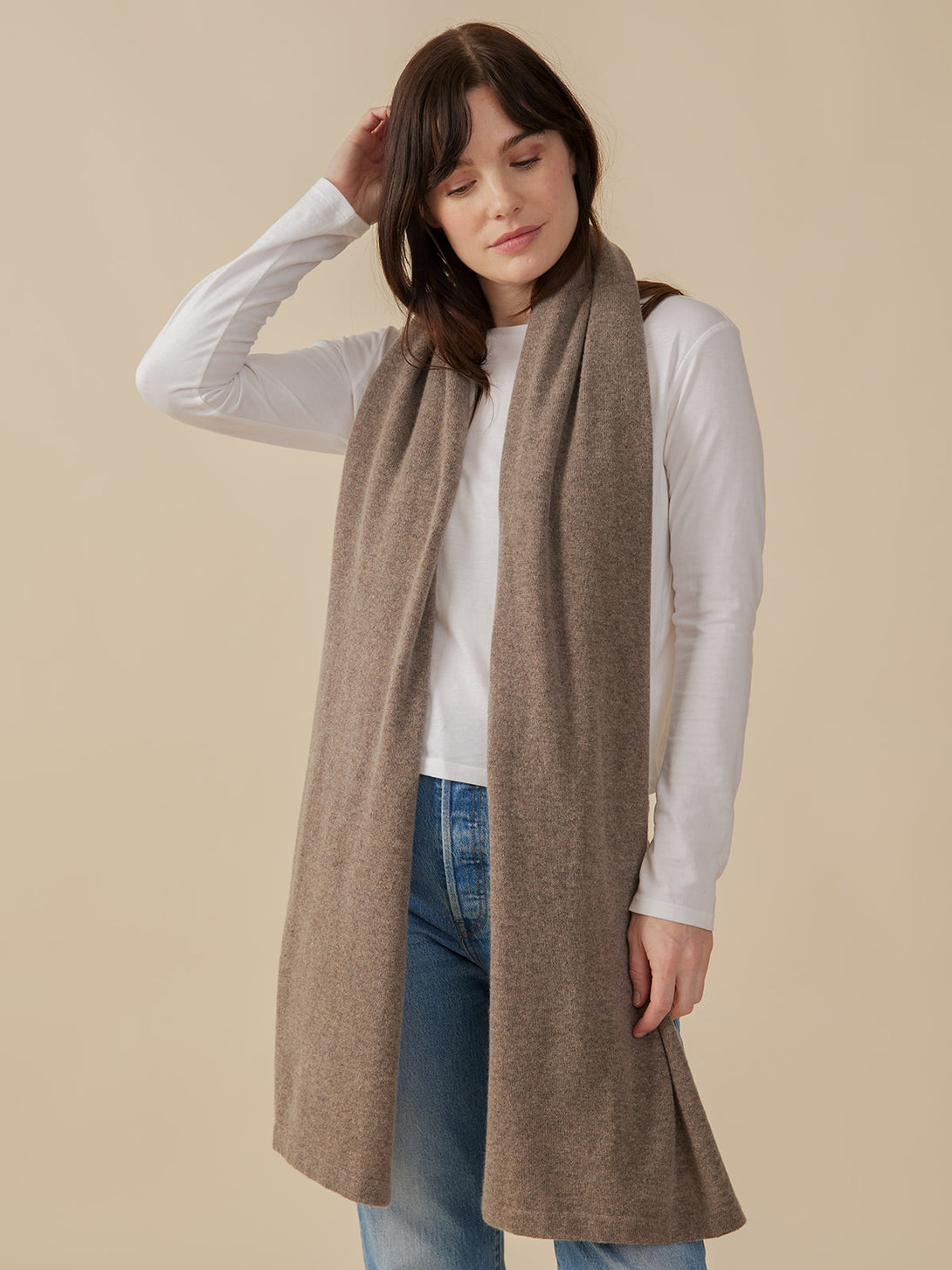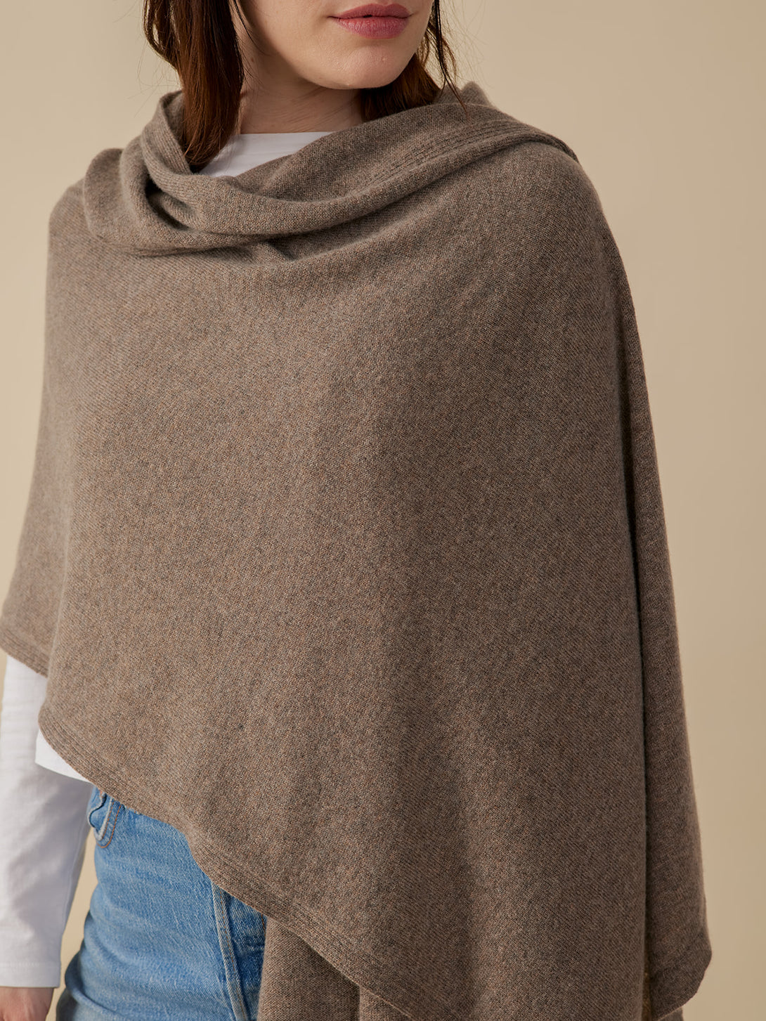 Indulge in luxury with this versatile cashmere wrap, featuring beautiful ribbed edge details, in a warm mocha. Add to the efficiency of your closet, with this multifunctional design that works as a scarf, shawl, or wrap, crafted from 100% small-batch cashmere, and made with care in Nepal.