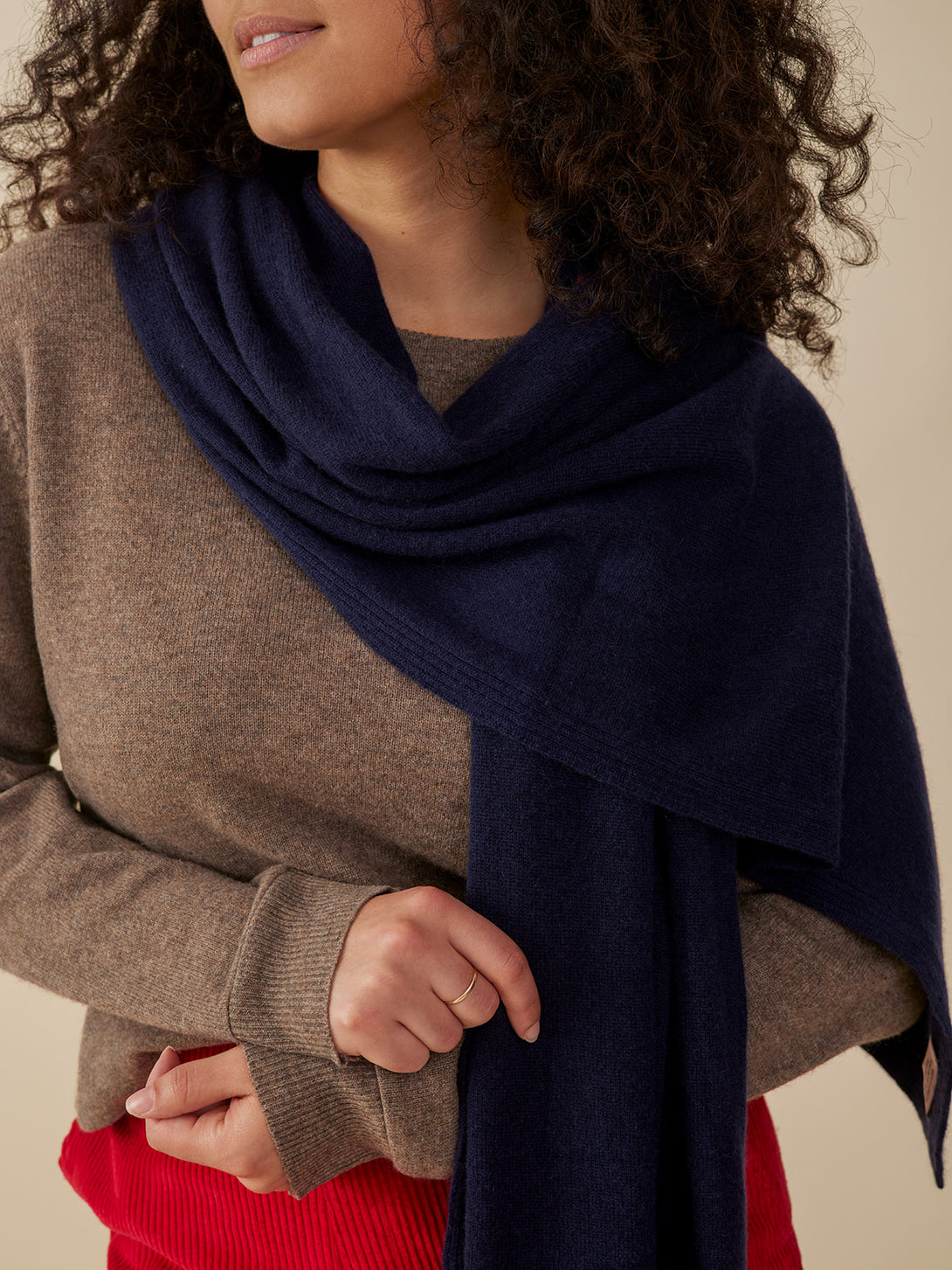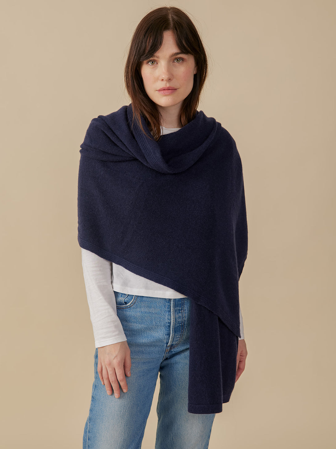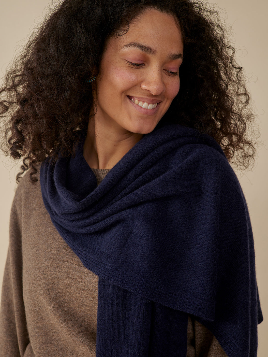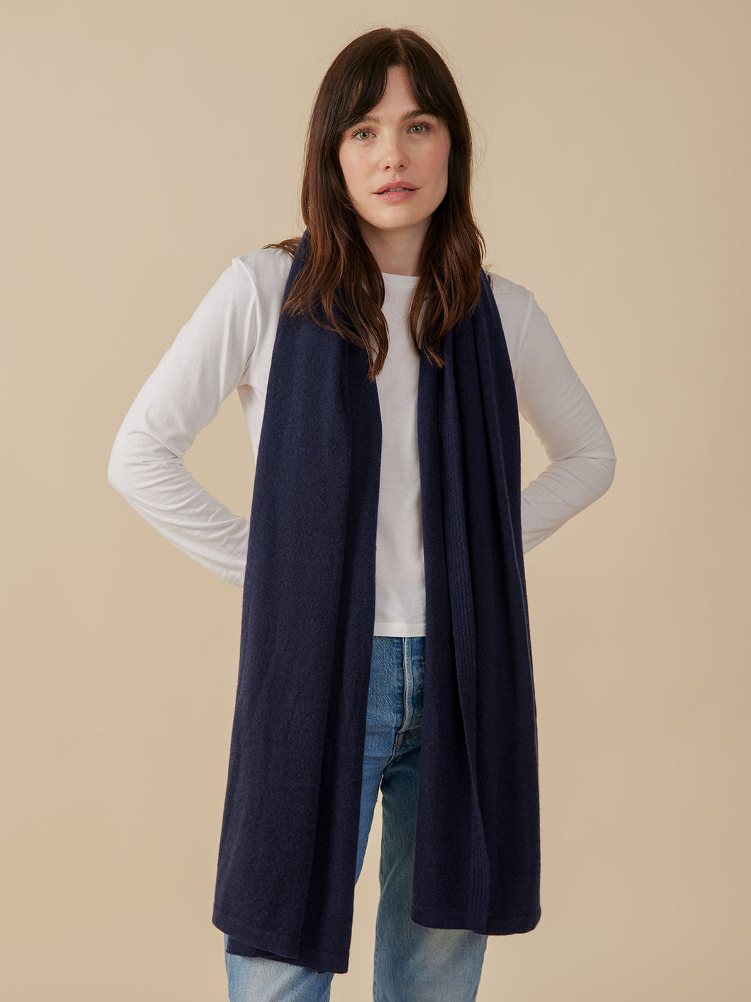 Indulge in luxury with this versatile cashmere wrap, featuring beautiful ribbed edge details, in a rich navy. Add to the efficiency of your closet, with this multifunctional design that works as a scarf, shawl, or wrap, crafted from 100% small-batch cashmere, and made with care in Nepal.