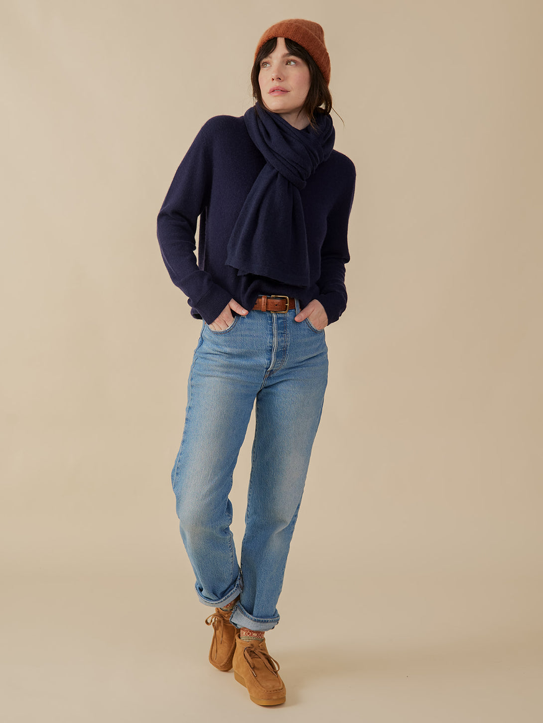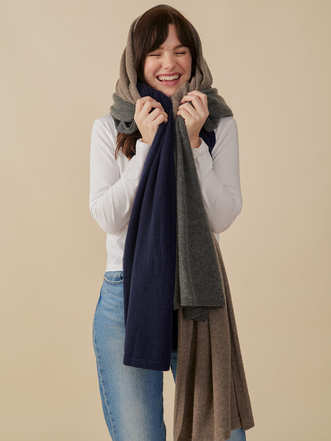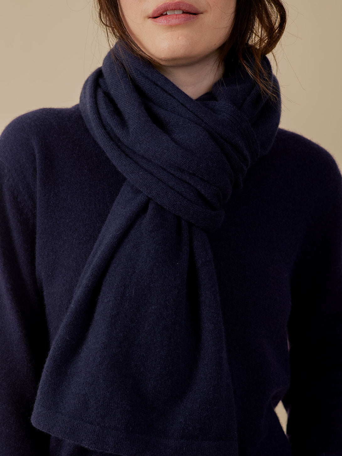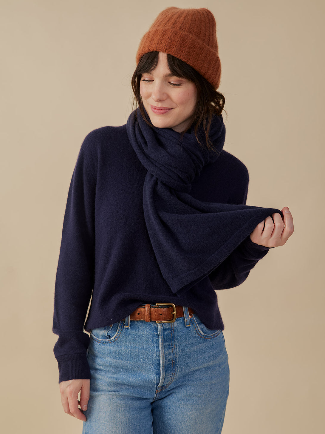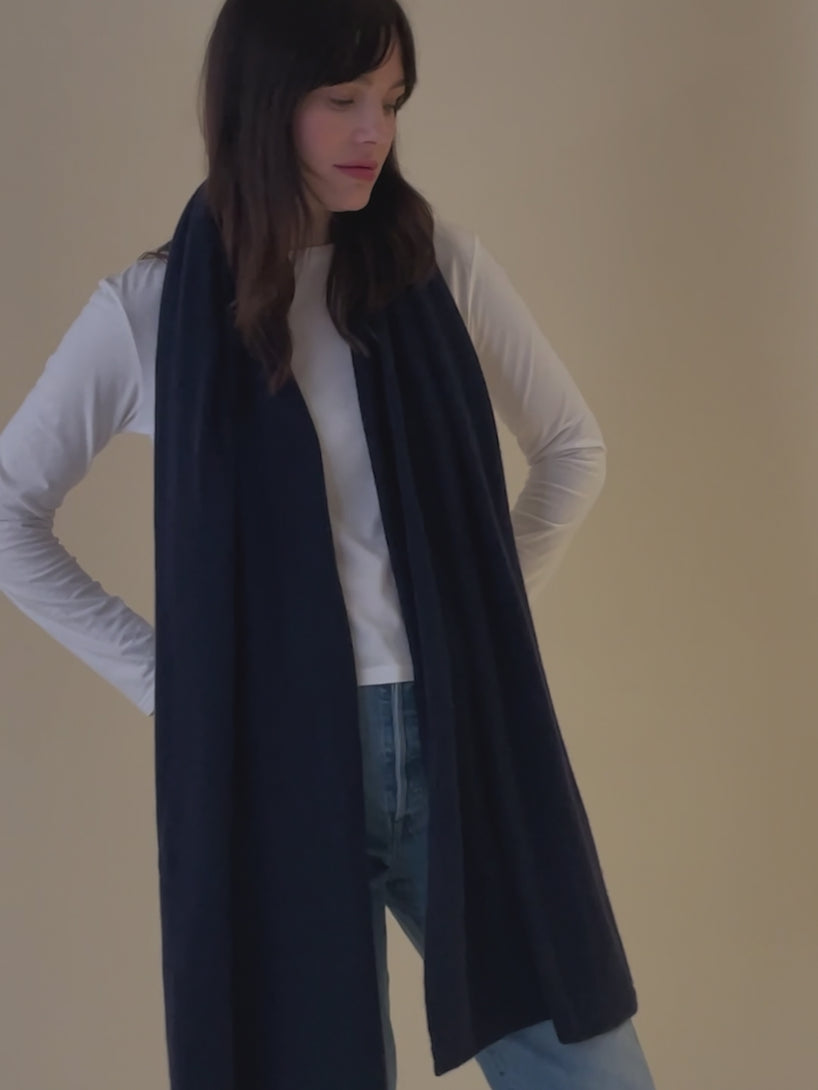 Indulge in luxury with this versatile cashmere wrap, featuring beautiful ribbed edge details, in a rich navy. Add to the efficiency of your closet, with this multifunctional design that works as a scarf, shawl, or wrap, crafted from 100% small-batch cashmere, and made with care in Nepal.