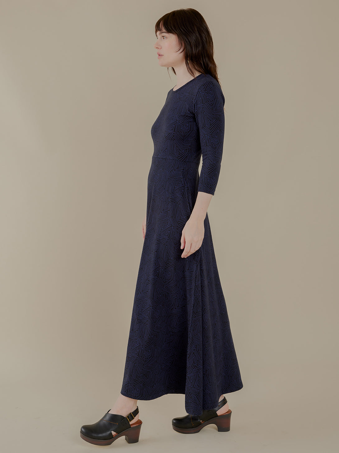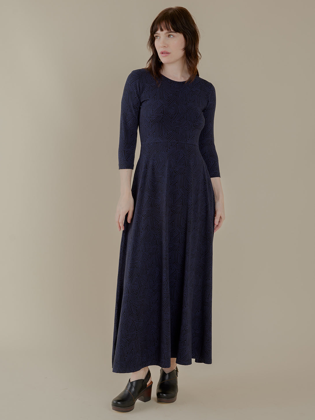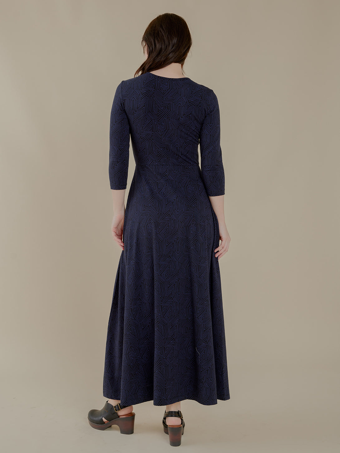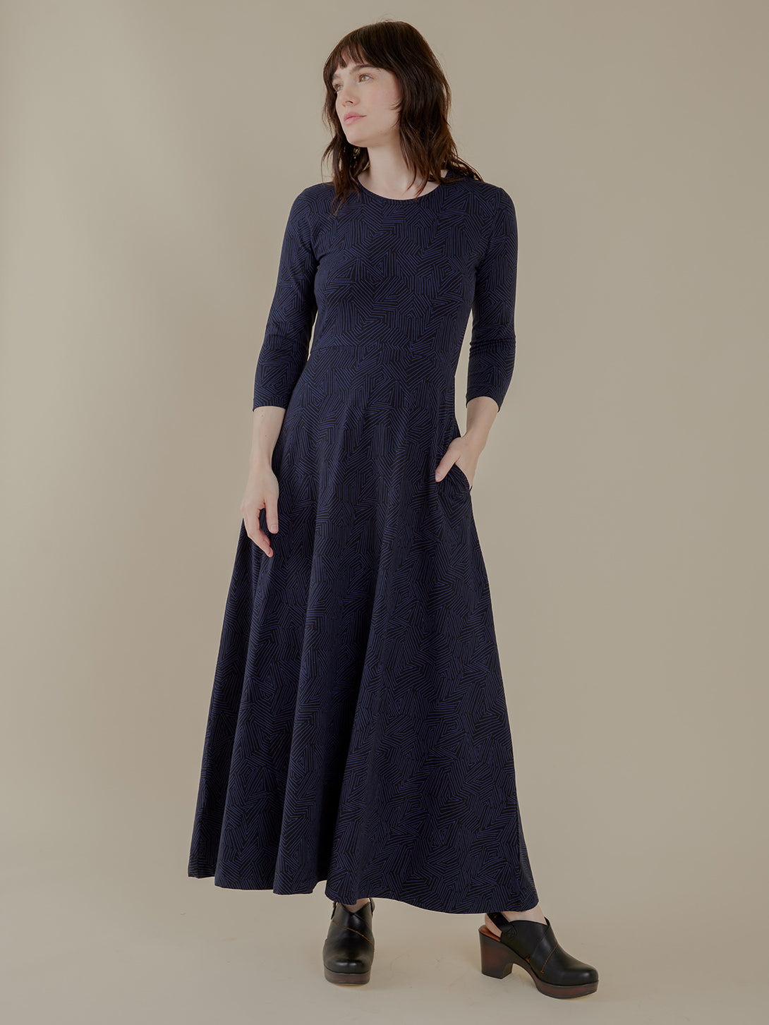 This stunning maxi dress features a hand drawn tree ring print and a chic silhouette with half sleeves. The sleek length creates beautiful movement and proportion, while convenient pockets add...
