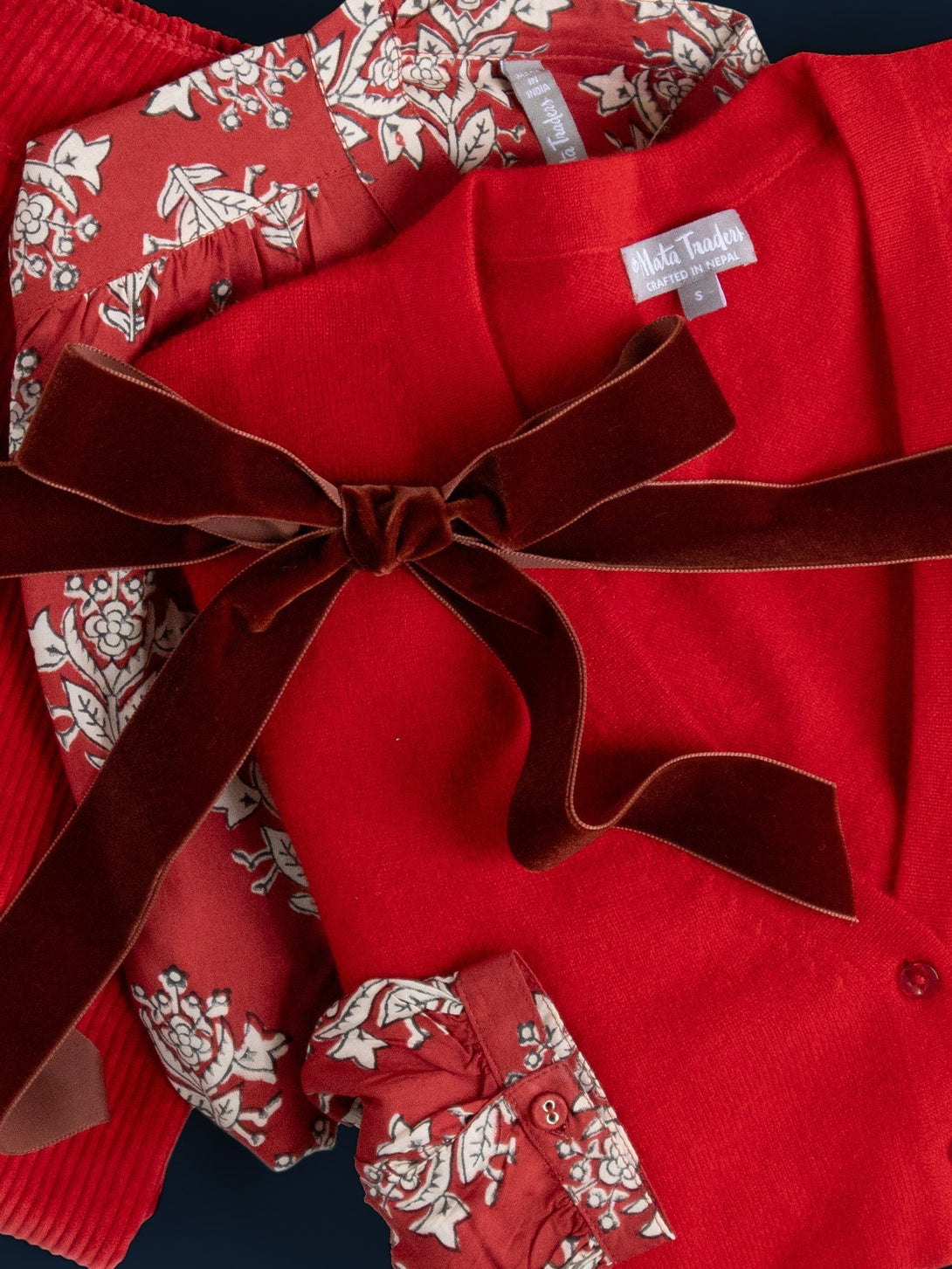 Discover vintage charm in this hip-length top featuring a bold red print and romantic long sleeves. The band collar and shoulder gathering creates beautiful drape and movement, crafted from modal, using traditional block printing techniques.