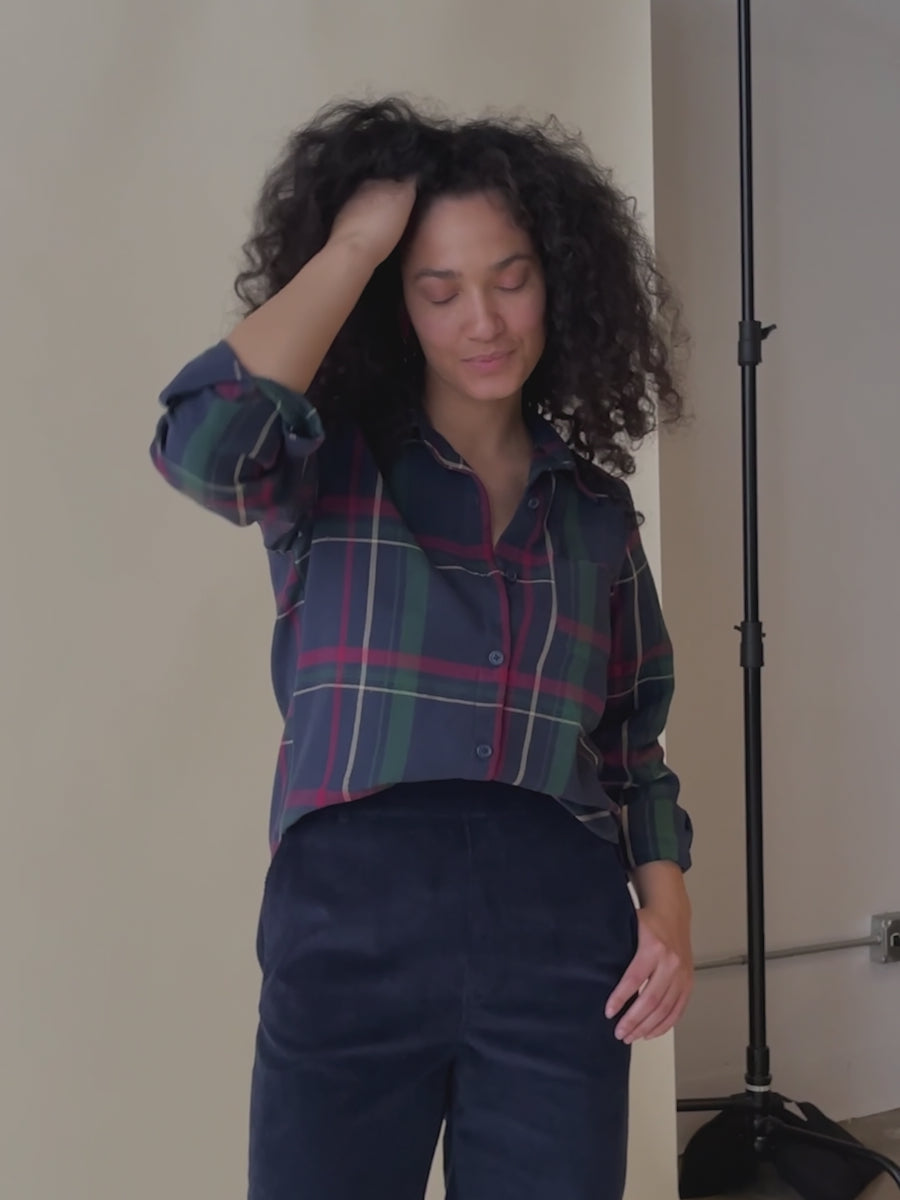 Layer in style with this button-down plaid shirt, featuring a cozy navy berry plaid in a relaxed fit with a curved hem. The magic comes from the contemporary relaxed silhouette...